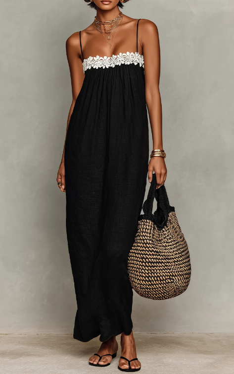 🌿Minimalist Linen-Blend Lace-Paneled Strapless With Spaghetti Straps Maxi Dress