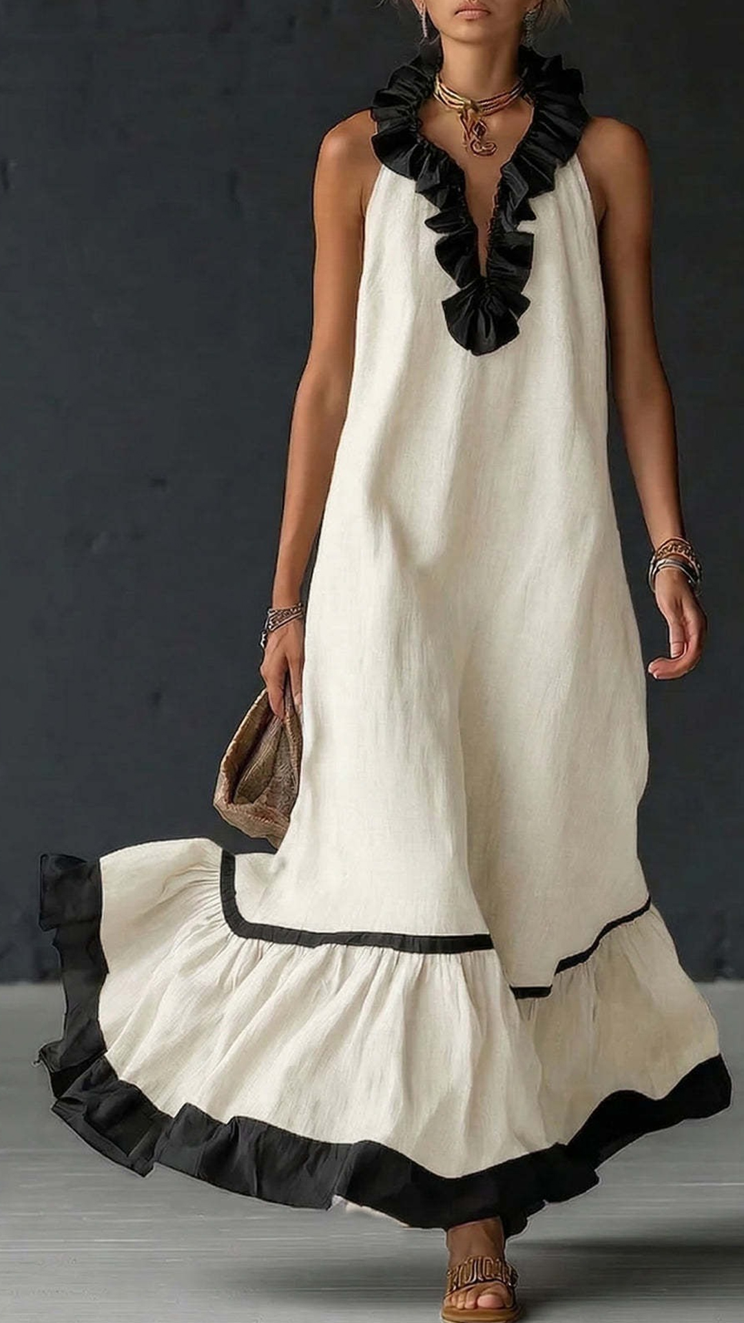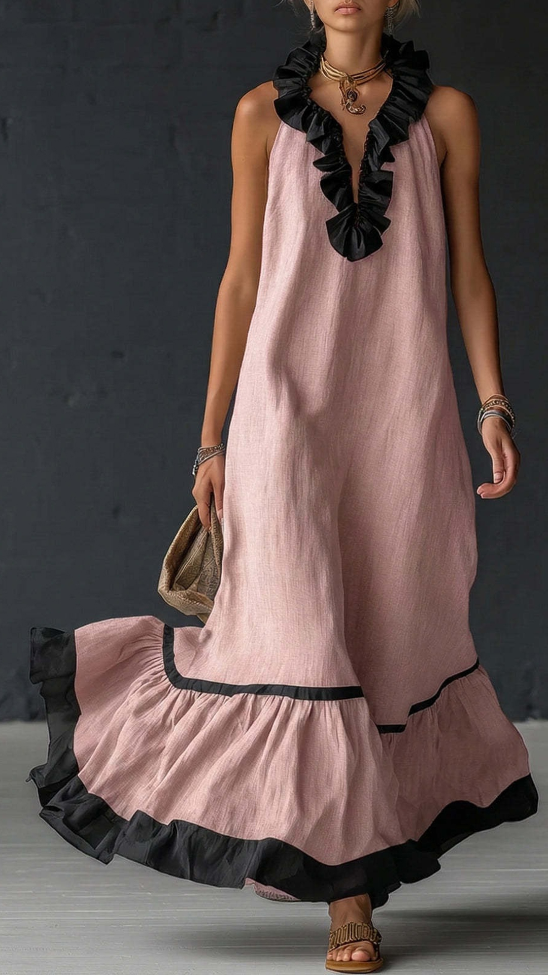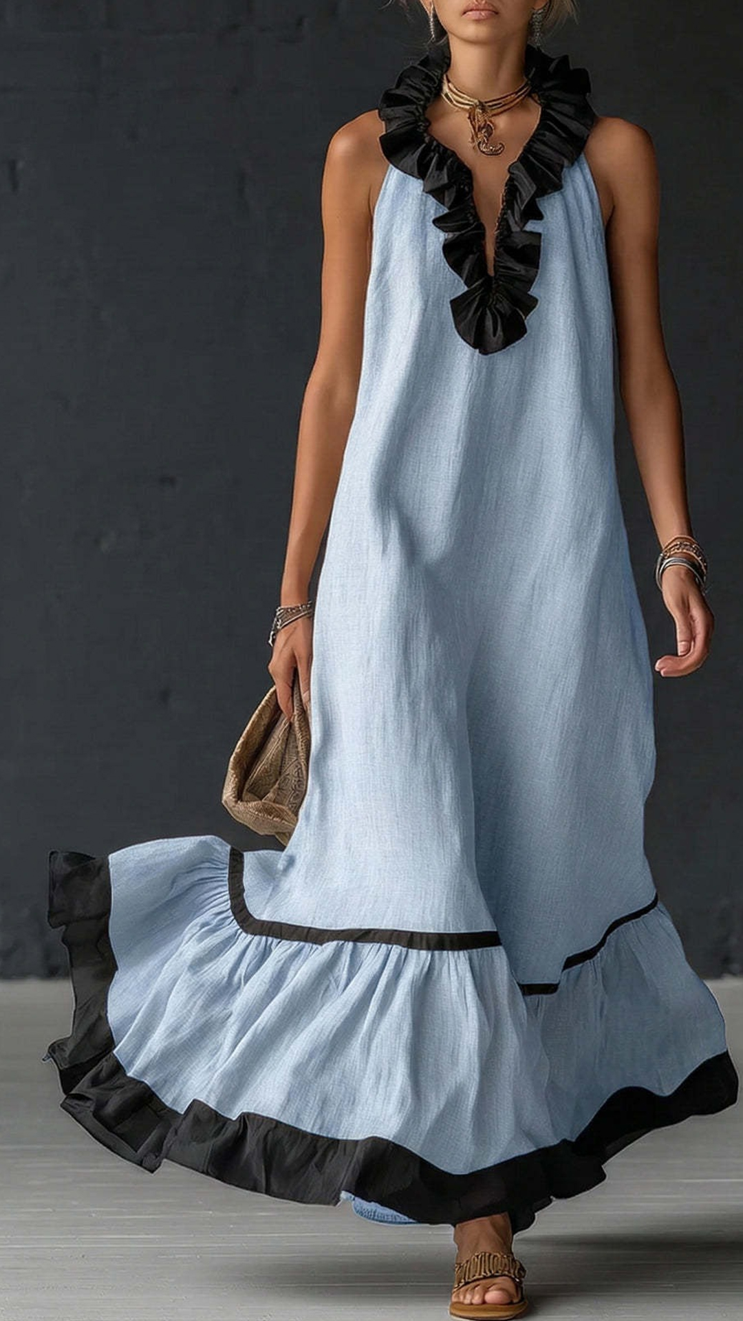 🌿Casual Style - Halter V-Neck Color-Block Ruffle Linen Maxi Dress
