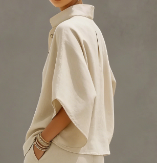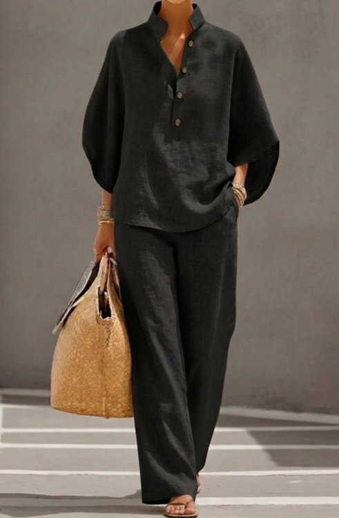 Featuring a relaxed batwing sleeve shirt and comfortable wide-leg trousers, this outfit delivers breathable comfort and a flattering silhouette. Whether you're heading out for brunch, travel, or casual daily wear, this set creates an elegant look with minimal effort.