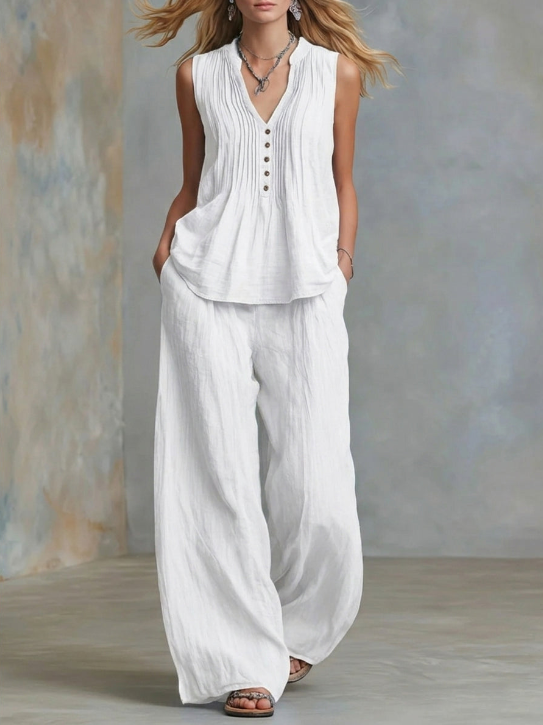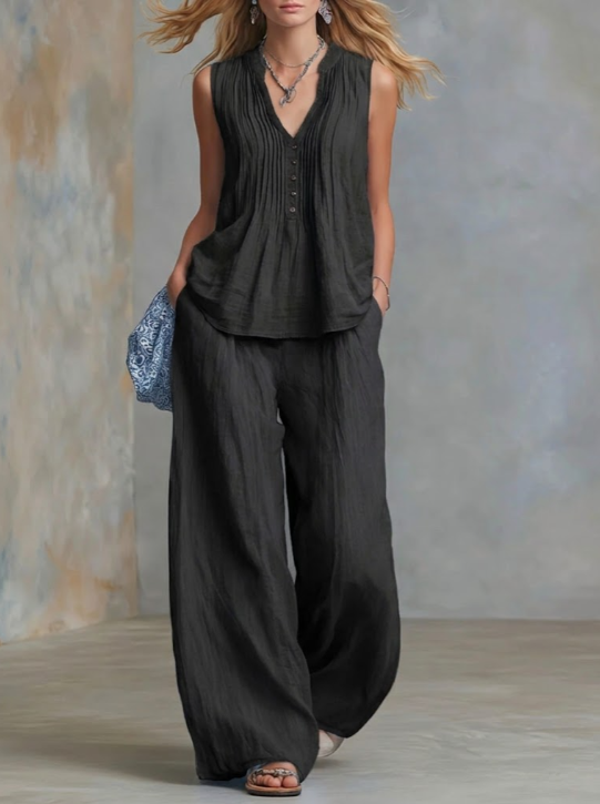 Featuring a relaxed Pleated Sleeveless Top and comfortable wide-leg trousers, this outfit delivers breathable comfort and a flattering silhouette. Whether you're heading out for brunch, travel, or casual daily wear, this set creates an elegant look with minimal effort.