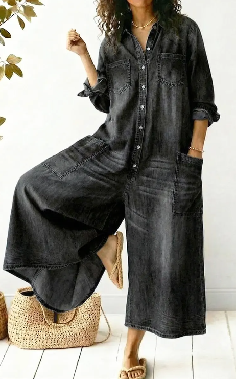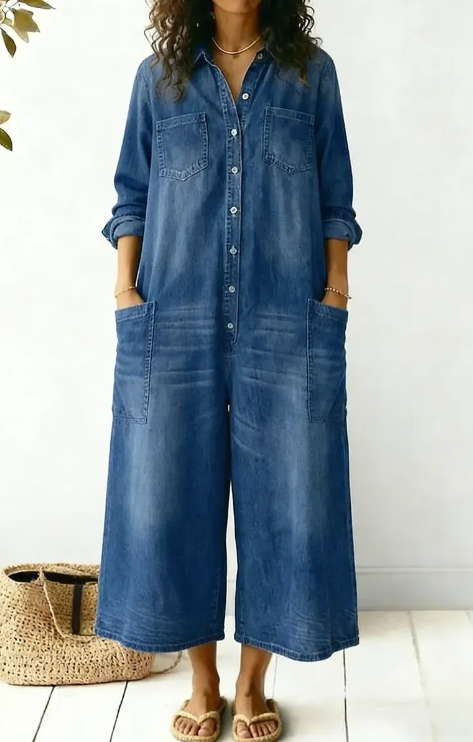 🌿Long-Sleeve Denim Jumpsuit with Patch Pockets